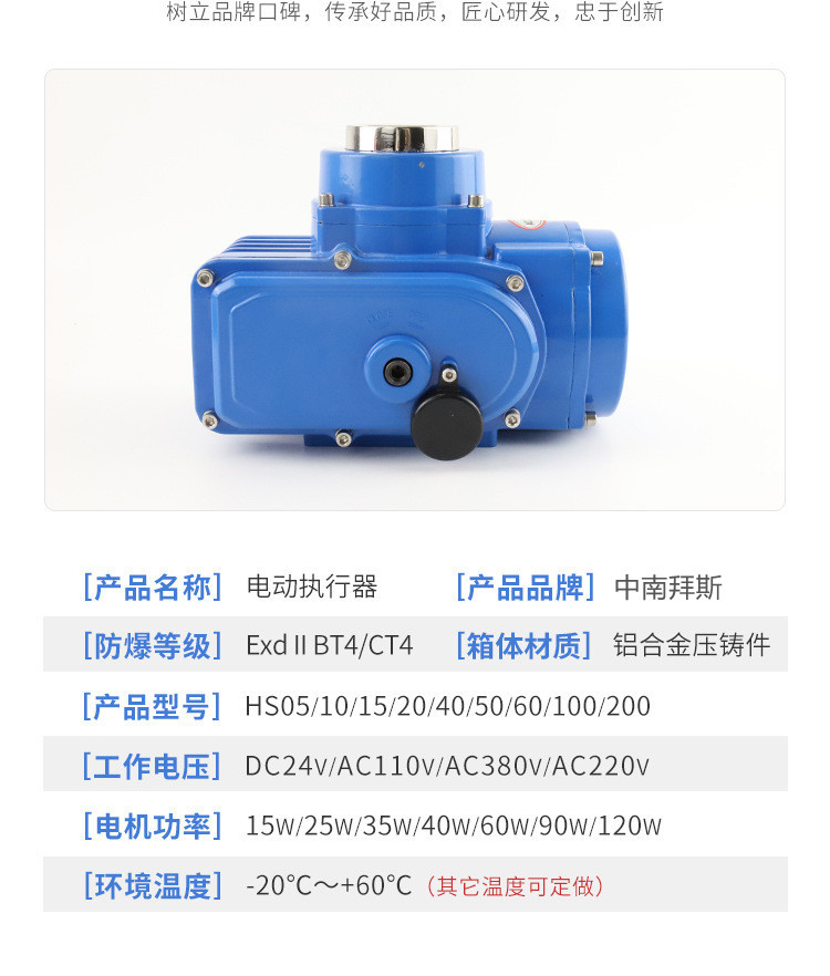 執行器,電動執行器90°120°180°270°旋轉角行程扭力控制分為開關無源觸點反饋型/智能調節型,特殊環境防爆、隔爆型。硬質鋁合金殼體 執行電源DC24v 、AC220v、AC380v等可選。內置過熱保護、中控反饋信號,指示器透視窗口,附帶斷電應急手動裝置 防護等級IP67 底部安裝尺寸符合ISO5211/DIN3337***際標準 適應環境溫80℃,環氧樹脂涂層。詳細數據由供應商另行提供。